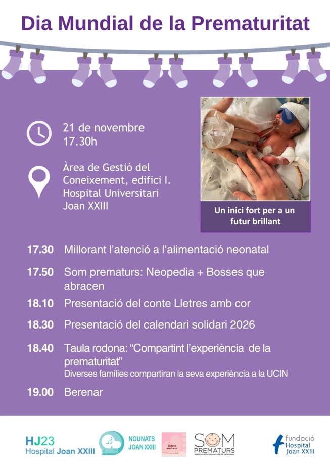 La Unidad de Neonatología del Servicio de Pediatría del Hospital Joan XXIII ha organizado, para este viernes 21 de noviembre, un encuentro con familias para celebrar el Día Mundial de la Prematuridad, que tendrá lugar a las 17:30 h en el Área de Gestión del Conocimiento (edificio I) del Parc Sanitari Joan XXIII.