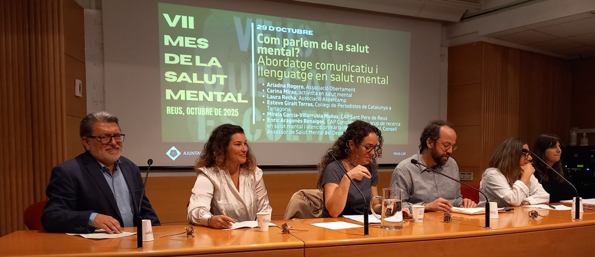La taula rodona “Com parlem de la salut mental? Abordatge comunicatiu i llenguatge en salut mental” va comptar amb les intervencions de Mireia Garcia-Villarrubia Muñoz, metgessa de família del CAP Sant Pere i referent de salut comunitària; i Enric Aragonès Benaiges, metge de família al CAP Constantí (ICS), investigador i director del grup de recerca en salut mental i atenció primària de l’IDIAP Jordi Gol, i membre del Consell Assessor de Salut Mental del Departament de Salut. També van prendre part Ariadna Rogero Arrufat, responsable de Mitjans i Activisme d’Obertament; Carina Miras, activista en salut mental; Laura Recha, directora d’Aspercamp i familiar d’una persona amb Trastorn de l’Espectre Autista; i Esteve Giralt Torras, corresponsal de RAC1 i La Vanguardia a Tarragona, i president del Col·legi de Periodistes de Catalunya a la demarcació.