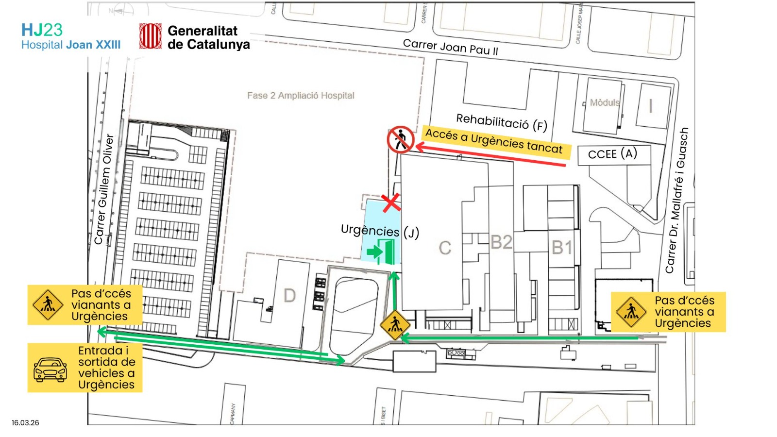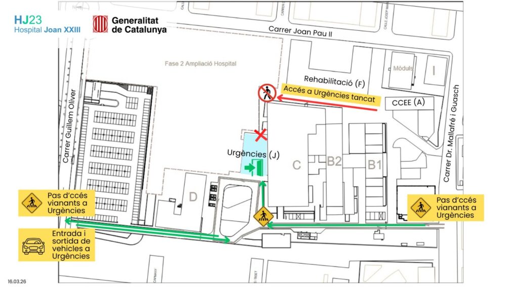 Això implica que les persones que accedeixin a Urgències des del carrer Mallafrè Guasch ho hauran de fer a través del vial interior, deixant l’edifici principal a la dreta. En canvi, tant l’accés a peu com amb vehicle des del carrer Guillem Oliver es mantindrà sense canvis.
